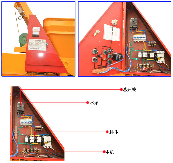 ●JS500混凝土攪拌機(jī)電氣控制線路設(shè)有空氣開關(guān)、熔斷器、熱繼電器,具有短路保護(hù)、過載保護(hù)的功能。